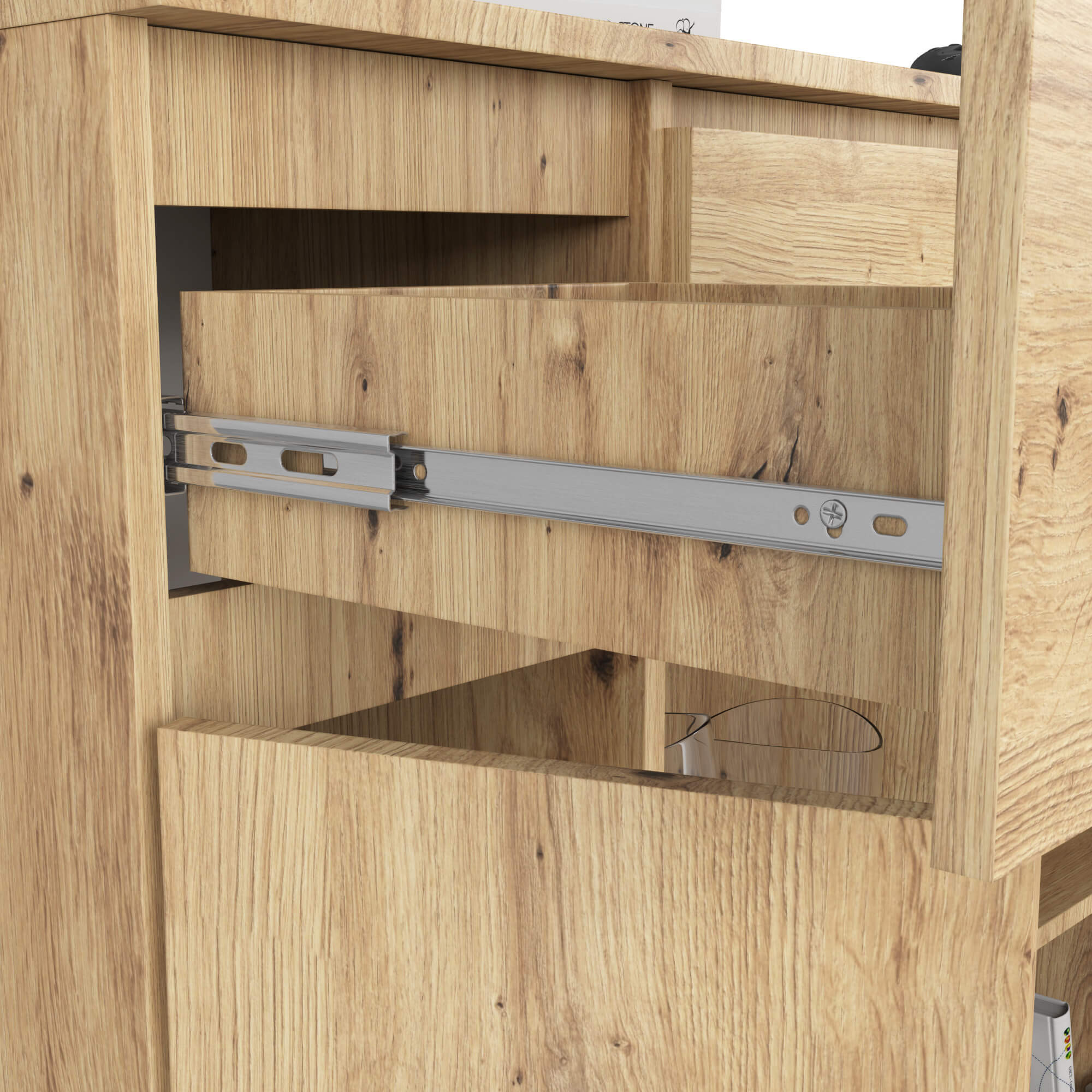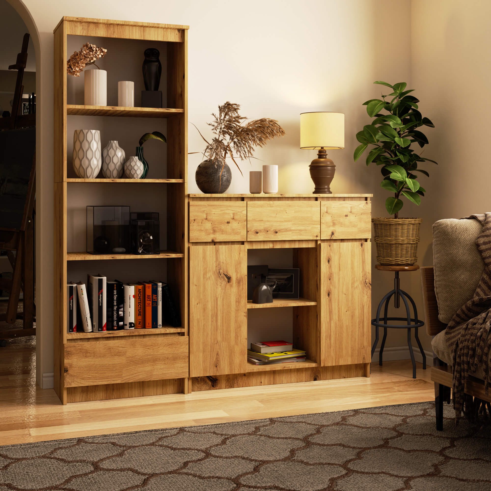 Odkryj nowoczesną funkcjonalność i elegancję, którą oferuje komoda do salonu o szerokości 101 cm. Wykończona w ponadczasowym kolorze Dąb Artisan, ten klasyczny mebel stojący jest idealny dla tych, którzy cenią estetykę połączoną z praktycznymi rozwiązaniami. Komoda jest starannie wykonana z wysokiej jakości płyty laminowanej o grubości 16 mm, co zapewnia odporność na ścieranie. Fronty szuflad oraz drzwi wykonane z tego samego materiału dodają wytrzymałości, a całość jest zabezpieczona obrzeżem ABS, które zwiększa trwałość oraz estetykę mebla.