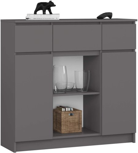 Fronty oraz boki komody zostały wykończone matowym laminatem w odcieniu szarości, oklejone odporną na uszkodzenia okleiną ABS, co dodatkowo podnosi walory estetyczne i wytrzymałościowe mebla. Komoda stanowi klasyczny element systemu meblowego, idealnie komponując się z różnorodnymi aranżacjami wnętrz.