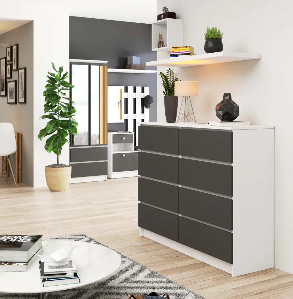 Komoda wyróżnia się nowoczesnym wyglądem, który łączy w sobie biel z eleganckim grafitem. Taki zestaw kolorystyczny sprawia, że mebel jest uniwersalny i doskonale pasuje do wielu stylów aranżacyjnych, od skandynawskiego po industrialny.