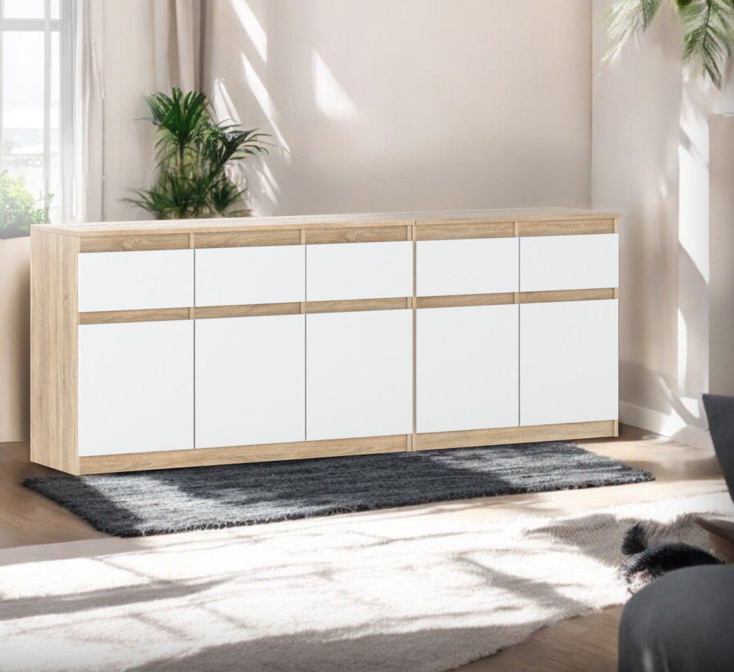 Komoda Best Oleksa to nowoczesny i stylowy mebel, który doskonale odnajdzie się w różnych przestrzeniach, takich jak salon, sypialnia czy przedpokój. Jej wymiary wynoszą 200 cm szerokości, 35 cm głębokości oraz 75 cm wysokości, co zapewnia obszerną przestrzeń do przechowywania oraz eksponowania ulubionych przedmiotów. Harmonijne połączenie korpusu w kolorze Dąb Sonoma z frontami w białym macie nadaje jej nowoczesny i uniwersalny charakter.