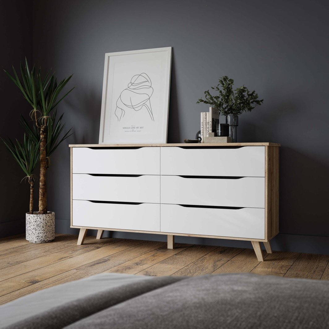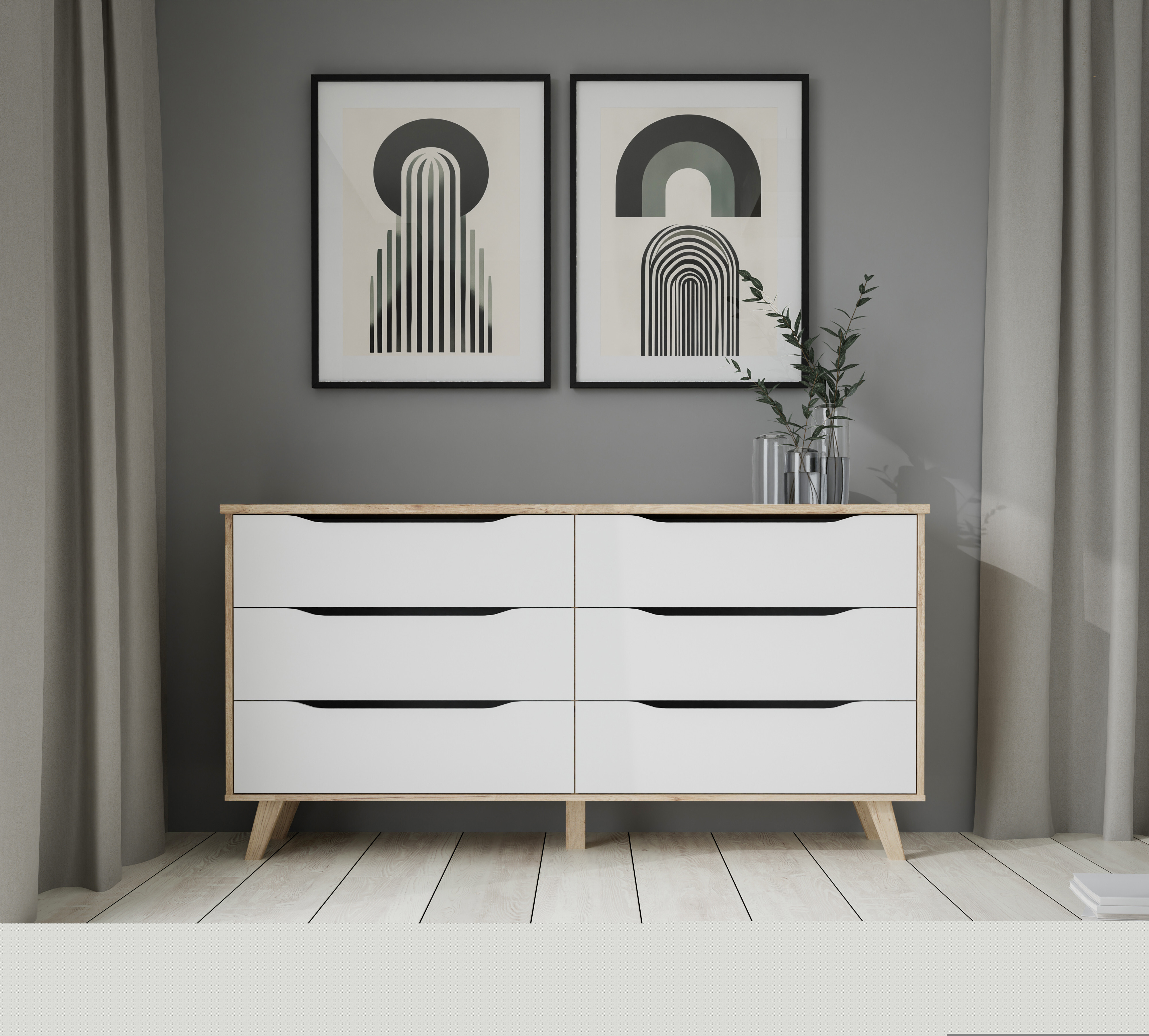 Komoda jest wyposażona w sześć pojemnych szuflad, z maksymalnym obciążeniem wynoszącym 3 kg, co pozwala na przechowywanie różnorodnych przedmiotów. Wyeksponowane nóżki podkreślają designerski wygląd produktu, a maksymalne obciążenie komody wynoszące 20 kg pozwala na umieszczenie na niej różnych dekoracji czy innych potrzebnych rzeczy. Łatwa do czyszczenia powierzchnia zapewnia utrzymanie komody w nienagannym stanie, co sprawia, że jest to mebel zarówno praktyczny, jak i estetyczny.