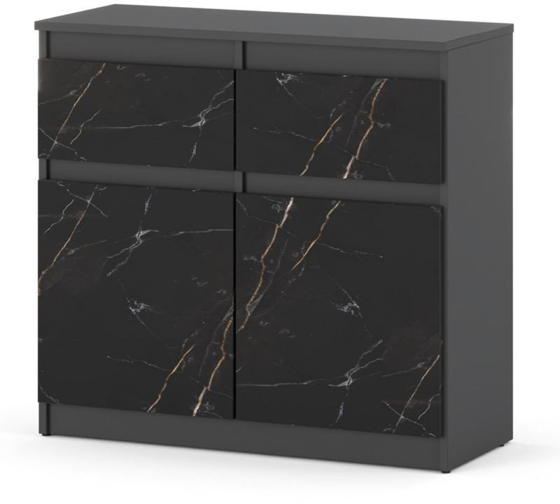 Komoda została zaprojektowana z myślą o praktyczności. Wyposażona w dwie pojemne szuflady oraz dwie półki za drzwiczkami, staje się doskonałym miejscem do przechowywania ubrań, akcesoriów domowych oraz dokumentów.