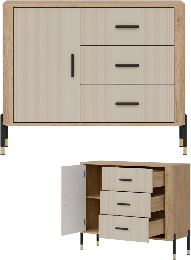 Komoda wyróżnia się ryflowanymi frontami w kaszmirowym odcieniu z matowym wykończeniem, które doskonale współgrają z naturalnym dębem cremona torro. Detale, takie jak czarne uchwyty oraz metalowe nóżki, nadają meblowi luksusowy wygląd. To idealny wybór do różnych stylów aranżacyjnych, od minimalistycznych po industrialne.