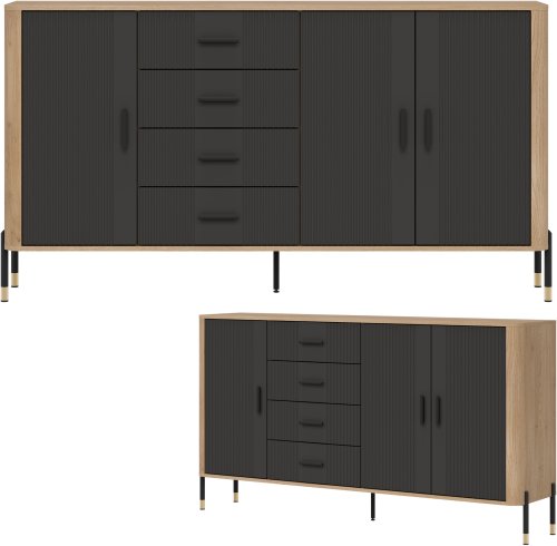 Komoda wyróżnia się ryflowanymi frontami w antracytowym odcieniu, które nadają jej nowoczesny wygląd. Metalowe uchwyty oraz nogi w czarno-złotym wykończeniu podkreślają jej elegancję, a dodatkowa noga w centralnej części zapewnia stabilność konstrukcji.