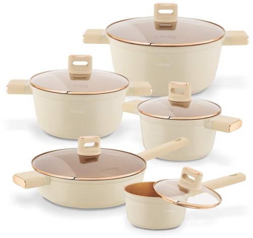 Zestaw Starlet Beige to funkcjonalny komplet garnków, rondla i patelni z odlewanego aluminium die cast, który nagrzewa się szybko i równomiernie. Ferromagnetyczne dno działa na wszystkich kuchenkach. Wnętrze naczyń pokrywa trwała, trzywarstwowa powłoka non-stick odporna do 8000 cykli ścierania i bezpieczna PFOA Free. Pokrywki z hartowanego szkła mają stalowy rant i odpowietrznik pary. Uchwyty soft touch są nienagrzewające i antypoślizgowe. Kolekcję poleca Katarzyna Bujakiewicz.
