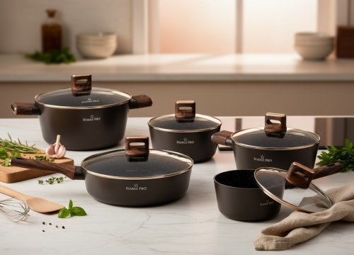 Elegancki komplet Starlet Brown to 10-elementowy zestaw garnków, rondla i patelni z powłoką nieprzywierającą MARBLE PLUS. Kute, aluminiowe korpusy typu forged gwarantują trwałość, szybkie i równomierne nagrzewanie oraz energooszczędne gotowanie. Dzięki dnu indukcyjnemu naczynia współpracują ze wszystkimi rodzajami kuchenek: gazową, elektryczną, ceramiczną i indukcyjną.