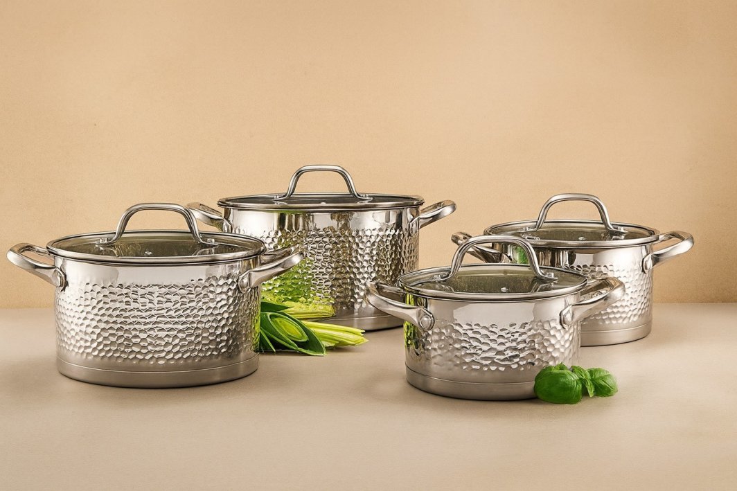 Wyjątkowe garnki wykonane są z wysokiej jakości stali nierdzewnej o unikalnej, młotkowanej strukturze, która nadaje im subtelny, elegancki wygląd i jednocześnie zapewnia odporność na uszkodzenia.