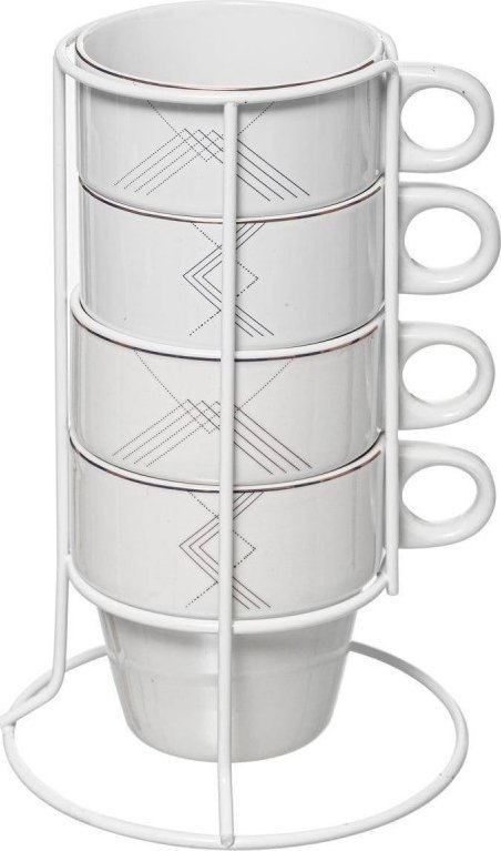 Komplet 4 porcelanowych kubków umieszczonych na metalowym stojaku. Cały zestaw jest biały z minimalistycznym zdobieniem. Zestaw zajmuje mało miejsca i sprawdzi się w każdej kuchni domowej oraz w biurze.