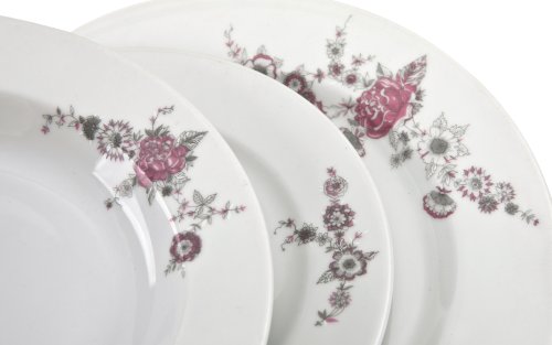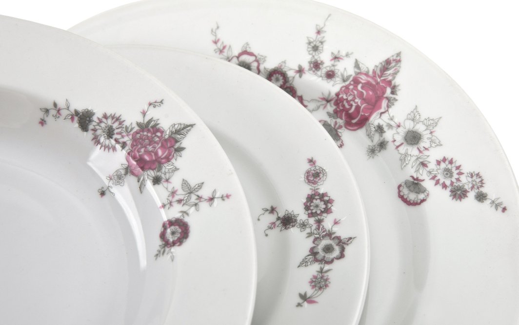 Efektowny zestaw talerzy dla 6 osób z serii Atelier Stock z gustowną dekoracją ciemnoróżowych kwiatów.