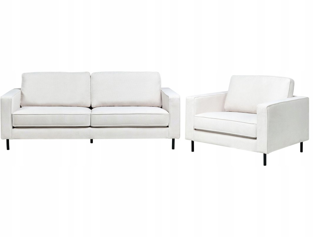 Komplet wypoczynkowy SAVALEN w odcieniu złamanej bieli to elegancki zestaw stworzony z myślą o czterech osobach, doskonały do salonu. Jego klasyczny wygląd harmonijnie wkomponuje się w różnorodne aranżacje wnętrz, a miękkie poduszki na siedziskach i oparciach gwarantują wygodę podczas relaksu. To znakomity wybór na wieczory filmowe z rodziną lub przyjaciółmi.