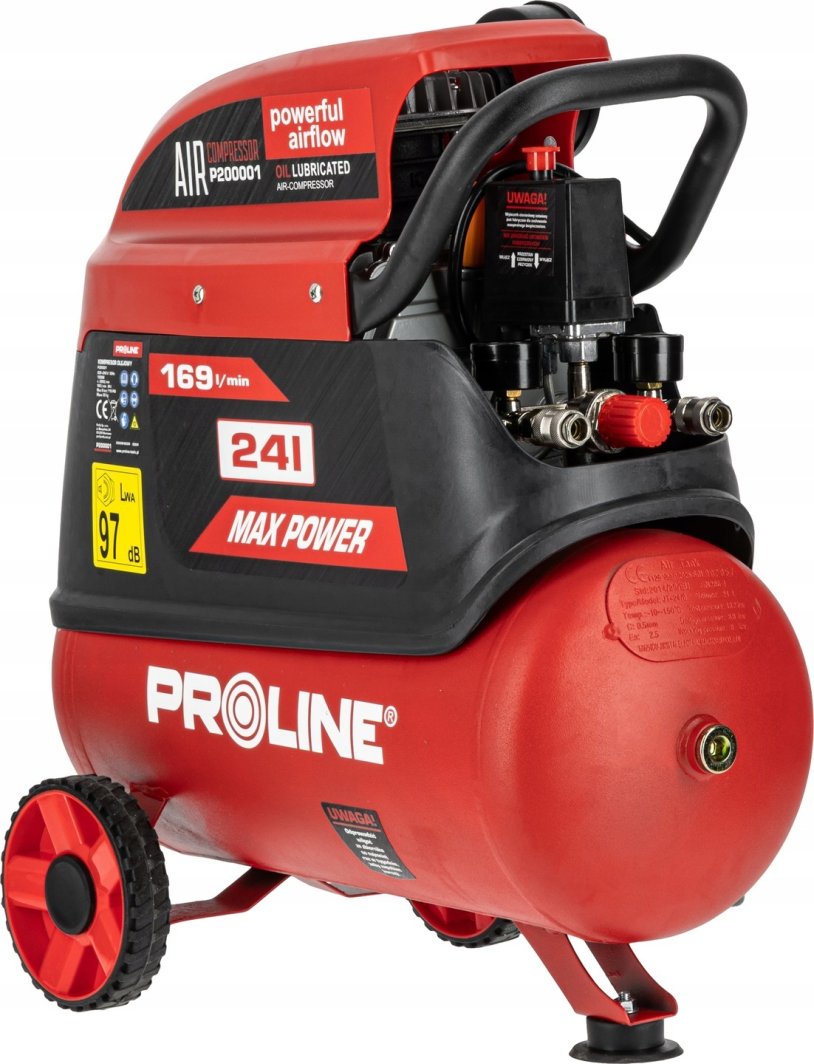 Kompresor PROLINE wyróżnia się wysoką wydajnością, wynoszącą 254 l/min, co czyni go idealnym do intensywnych zadań. Poziom hałasu oscyluje w granicach 60-70 dB, co sprawia, że jest to urządzenie stosunkowo ciche w porównaniu do innych kompresorów. Dodatkowo, dzięki zamontowanym kółkom transportowym, kompresor jest mobilny, co ułatwia jego przemieszczanie w różnych lokalizacjach.