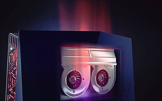 Aby utrzymać czystą, schludną linię obudowy, ROG G20 pozbawiono widocznych zewnętrznych wylotów powietrza. Posiada zintegrowany system chłodzenia, który korzysta z naturalnej konwekcji i posiada ukryty tunel powietrzny, który odpowiada za wydajne zarządzanie ciepłem. Tunel powietrzny o szerokości 1 cm zaciąga powietrze z dolnej części obudowy, a wentylatory procesora graficznego przekierowują gorące powietrze na zewnątrz, na tył obudowy. Dwa dodatkowe wewnętrzne wentylatory i miedziane rurki dodatkowo wspierają rozpraszanie ciepła poprzez żebra umieszczone na górze obudowy. Taka dbałość o szczegół umożliwia chłodne i stabilne działanie.