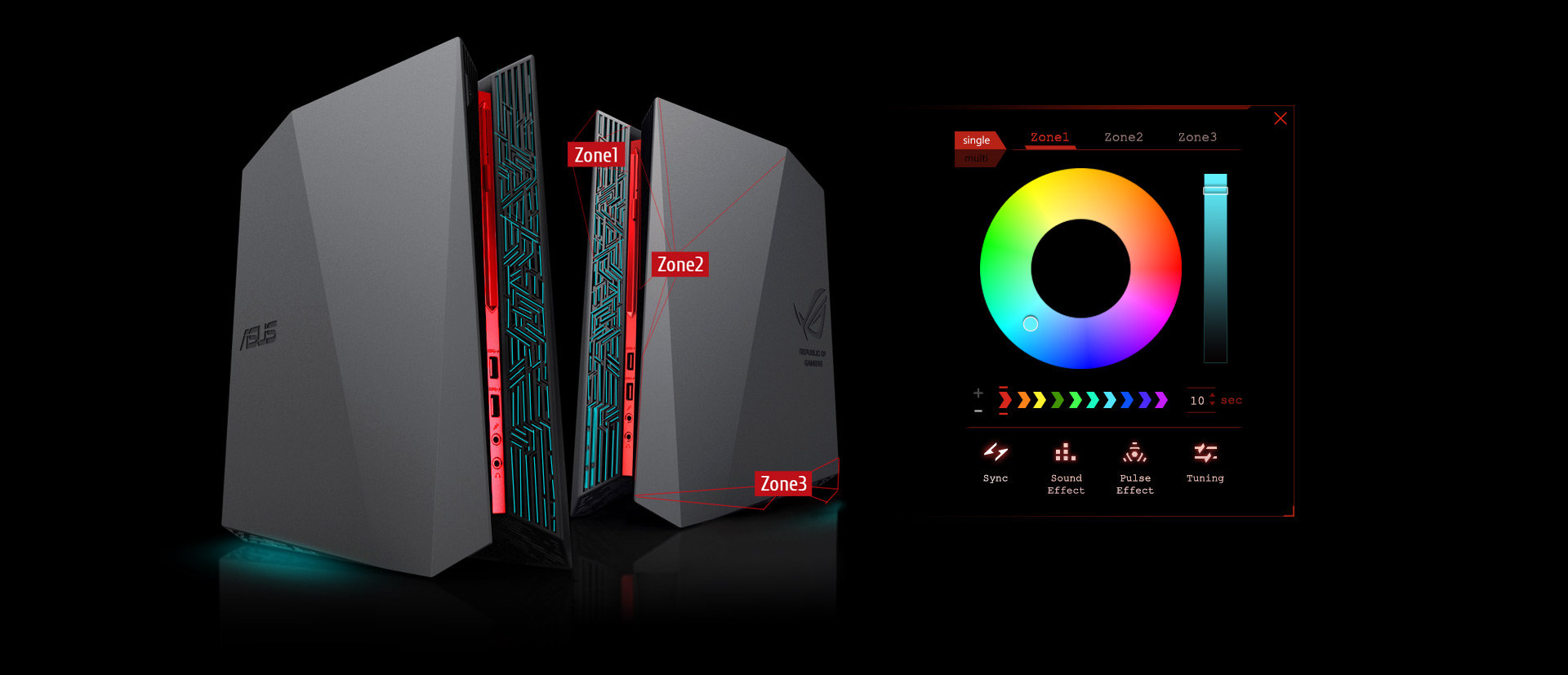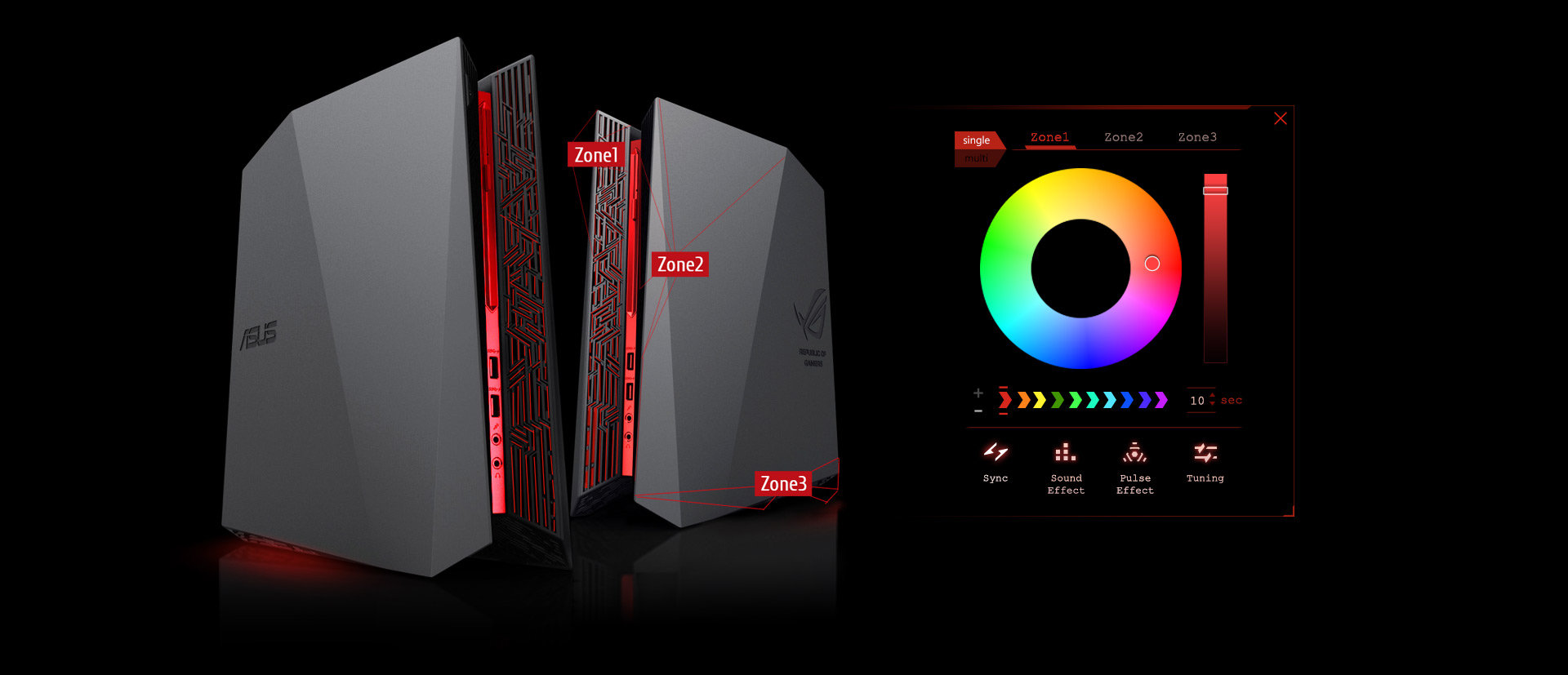 Gamingowy komputer stacjonarny ma przenieść Cię w świat rozgrywki nie tylko za sprawą realistycznego obrazu, ale także wysokiej jakości dźwięku. Aby wprowadzić Cię prosto w serce batalii, SonicMaster korzysta z odpowiedniego sprzętu i oprogramowania do dostrajania dźwięku. Bez względu na to czy korzystasz ze słuchawek czy głośników, pochłonie Cię pełnia brzmienia, w którym usłyszysz każdy wystrzał z broni, huk eksplozji, a nawet kroki przeciwnika, które będą dla Ciebie czytelnym sygnałem na cyfrowym polu bitwy. Dźwięk, który dostarczy ROG AudioWizard zapewni dodatkowy poziom wzmocnienia sygnału; z łatwością możesz przełączać się między pięcioma wstępnie zdefiniowanymi trybami odtwarzania.