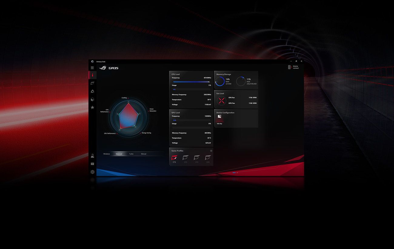 Uzyskanie idealnych wrażeń podczas korzystania z komputera wymaga szczegółowej personalizacji i procesów dostosowywania. Uzyskaj szybki dostęp do ulubionych ustawień niestandardowych z ulepszoną technologią ROG Keystone II. Pochwal się swoim stylem w żywych kolorach całej gamy urządzeń kompatybilnych z Aura Sync. Dostosuj profile scenariuszy i uzyskaj dostęp do innych kluczowych ustawień systemowych w jednym miejscu z ROG Armoury Crate. Dzięki wszystkim dostępnym funkcjom personalizacji możesz dostosować GA35 do swoich potrzeb.