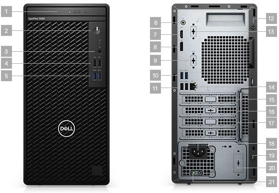1. Napęd optyczny (opcjonalnie) | 2. Przycisk zasilania | 3. Uniwersalne gniazdo audio | 4. 2 porty USB 2.0 (z przodu) | 5. 2 porty USB 3.2 Type-A pierwszej generacji (z przodu) | 6. Wyjście liniowe | 7. HDMI 1.4 | 8. DisplayPort 1.4 | 9. Opcjonalny port wideo: DP 1.4 / HDMI 2.0b / VGA | 10. 2 porty USB 3.2 Type-A pierwszej generacji (z tyłu) | 11. 2 porty USB 2.0 z funkcją Smart Power (z tyłu) | 12. Śruba skrzydełkowa | 13. Opcjonalny port szeregowy/PS2 | 14. Port RJ-45 10/100/1000 Mb/s | 15. Gniazdo PCIe x1 | 16. Gniazdo PCIe x1 | 17. Gniazdo PCIe x16 | 18. Złącze zasilania | 19. Śruba skrzydełkowa | 20. Gniazdo zewnętrznej anteny sieci bezprzewodowej | 21. Wskaźnik zasilania