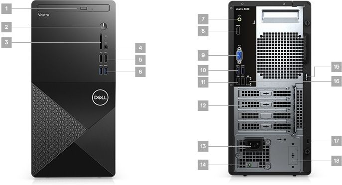 1 Napęd optyczny | 2. Przycisk zasilania | 3. Czytnik kart pamięci 5 w 1 | 4. Gniazdo combo audio | 5. 2 porty USB 2.0 | 6. 2 porty USB 3.2 Type-A pierwszej generacji | 7. Wyjście liniowe | 8. HDMI | 9. Złącze VGA | 10. 2 porty USB 3.2 Type-A pierwszej generacji | 11. 2 porty USB 2.0 | 12. Gniazda kart rozszerzeń | 13. Zasilacz | 14. Wskaźnik diagnostyczny zasilacza | 15. Gniazdo blokady z kłódką | 16. Port RJ-45 Ethernet | 17. Gniazdo blokady klinowej | 18. Gniazda kart rozszerzeń