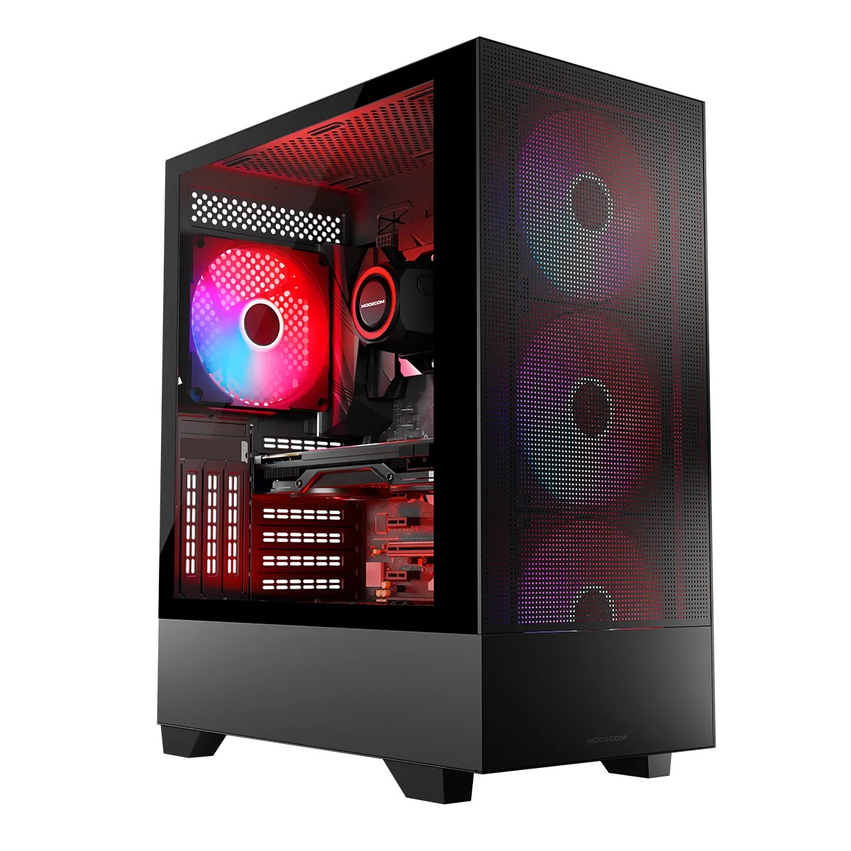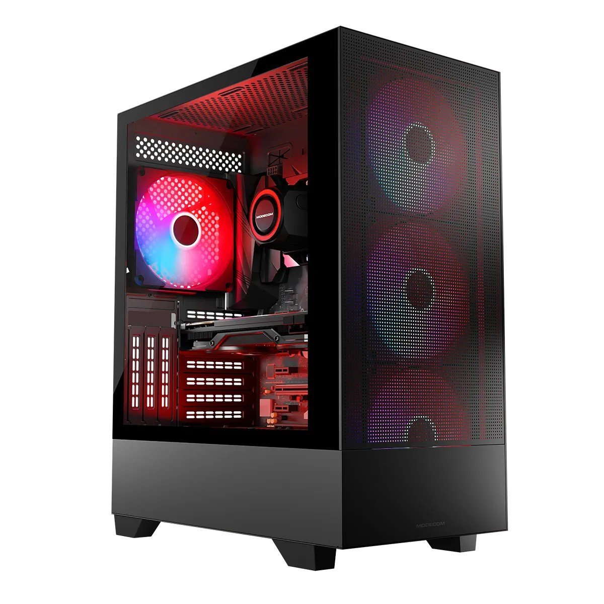 MODECOM Siroco z zainstalowanymi fabrycznie czterema wentylatorami ARGB, przewiewnym panelem frontowym i górnym oraz nowoczesnymi rozwiązaniami daje efekt wydajnego, cichego i przede wszystkim chłodnego komputera. Kolor podświetlenia i prędkość obrotów zainstalowanych wentylatorów ARGB możesz ustawić za pomocą wbudowanego kontrolera ARGB.