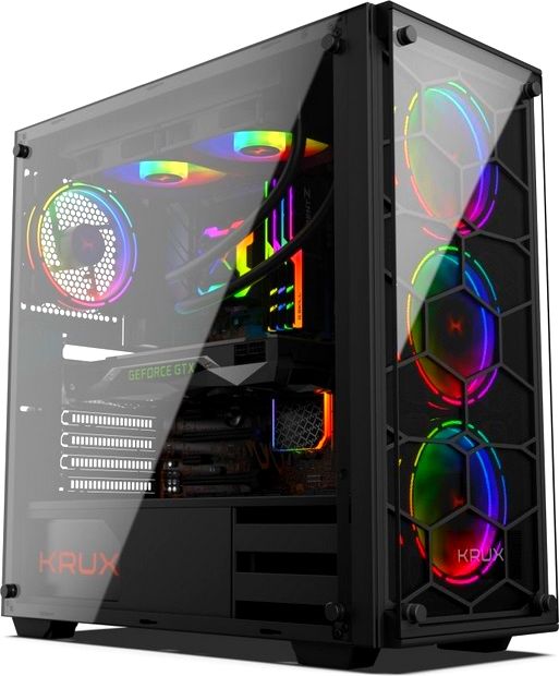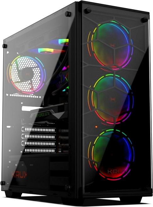 4szt wentylatorów RGB 120mm Silent. Bardzo dobrze wyposażona obudowa o świetnych parametrach wentylacji, wykonana ze szkła hartowanego. Pozwala to na elegancką prezentację podświetlonego zestawu zainstalowanego w środku. Na górze eleganckiego panelu frontowego znajduje się duży przycisk zasilania, mały przycisk reset, dwa porty USB 3.0, zestaw złącz audio.