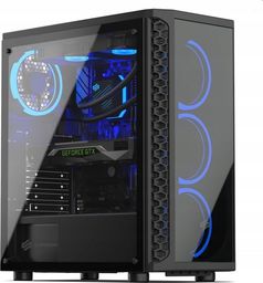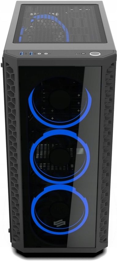 Sterowanie kolorami wentylatorów za pomocą oprogramowania. Bardzo dobrze wyposażona obudowa o świetnych parametrach wentylacji, wykonana ze szkła hartowanego. Pozwala to na elegancką prezentację podświetlonego zestawu zainstalowanego w środku. Na górze eleganckiego panelu frontowego znajduje się duży przycisk zasilania, mały przycisk reset, dwa porty USB 3.0, zestaw złącz audio.