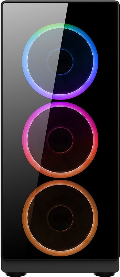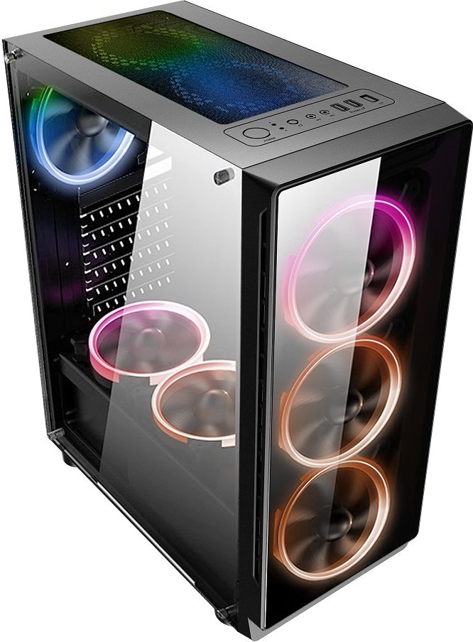 Bardzo dobrze wyposażona obudowa o swietnych parametrach wentylacji, 3 wentylatory RGB sterowane pilotem w cenie, panel przedni i boczny wykonany z przezroczystej plexi. Pozwala to na elegancka prezentacje podswietlonego zestawu zainstalowanego w srodku. Na górnej krawedzi eleganckiego panelu frontowego znajduje sie duzy przycisk zasilania, maly przycisk reset, dwa porty USB 3.0, oraz zestaw zlacz audio. Jeśli chcesz większą ilość wentylatorów, możesz dokupić na naszych aukcjach UPGRADE