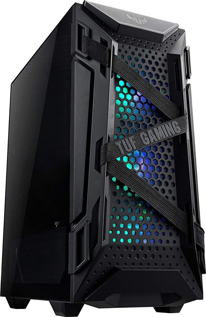 Kompaktowa obudowa mid-tower ASUS TUF Gaming GT301 ATX z panelem bocznym ze szkła hartowanego, panelem przednim o strukturze plastra miodu, 120-milimetrowym wentylatorem AURA adresowalnym RGB, wieszakiem na słuchawki i wspornikiem chłodnicy 360 mm.