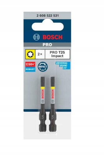 Końcówka wkręcająca PRO T25 Impact od uznanej marki Bosch to znakomity wybór dla tych, którzy cenią sobie niezawodność oraz wysoką jakość narzędzi. Zestaw składa się z dwóch bitów udarowych, które gwarantują efektywne wkręcanie i są idealne do intensywnego użytkowania w różnych projektach.