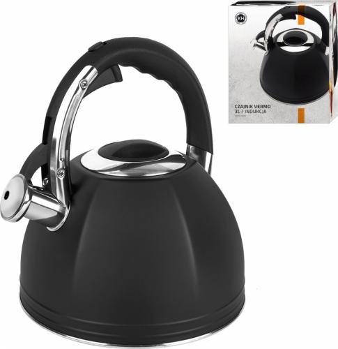 Czajnik nierdzewny Konighoffer Vermo 3 l czarny świetnie prezentuje się na kuchence, więc zyskujesz stylowe wyposażenie kuchni. Wyjmowana pokrywa i gwizdek uchylany mechanizmem w rączce ułatwiają przygotowanie napojów i zapewniają bezpieczeństwo. Stal nierdzewna daje czajnikowi trwałość, odporność, a także dba o zdrowie twoich bliskich (nie wpływa na właściwości wody). Wystarczy jedna ręka, by napełnić czajnik lub napełnić z jego pomocą kubki wrzątkiem. Możesz gotować w nim wodę na indukcji oraz oszczędzić przy tym czas i energię. Bez problemu poradzisz sobie z jego odkamienianiem. Oryginalny i wyróżniający się kształt korpusu urozmaici wyposażenie twojej kuchni.