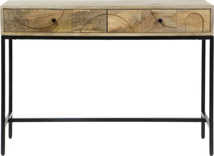 Elegancka konsola, której górna część została wykonana z drewna mango. Podstawę stanowi metalowy, czarny stelaż. Całość sprawia wrażenie lekkości. Dwie szufladki wyposażono w kołeczki i półkoliste zdobienia na melanżowej powierzchni.