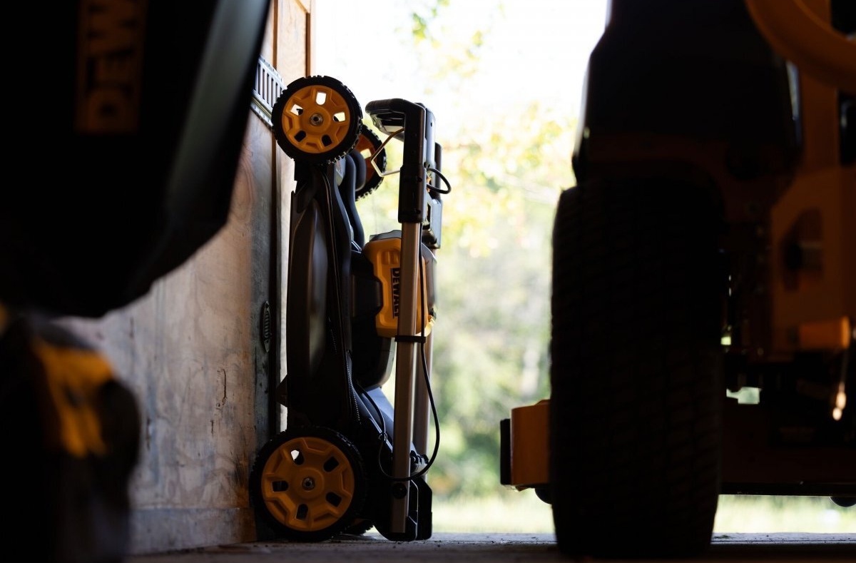 Projektanci DeWALT zadbali o maksymalny komfort użytkowania oraz łatwość przechowywania narzędzia po skończonej pracy. Kosiarka posiada w pełni składaną rękojeść, co w połączeniu z możliwością pionowego ustawienia sprawia, że zajmuje ona minimalną ilość miejsca w garażu czy szopie. Na panelu sterującym umieszczono czytelny wskaźnik stanu naładowania akumulatora, dzięki czemu operator ma pełną kontrolę nad pozostałym czasem pracy. Duże, amortyzowane koła o średnicy 18 cm z przodu i 23 cm z tyłu ułatwiają manewrowanie maszyną nawet na nierównym terenie, zapewniając płynność ruchu.