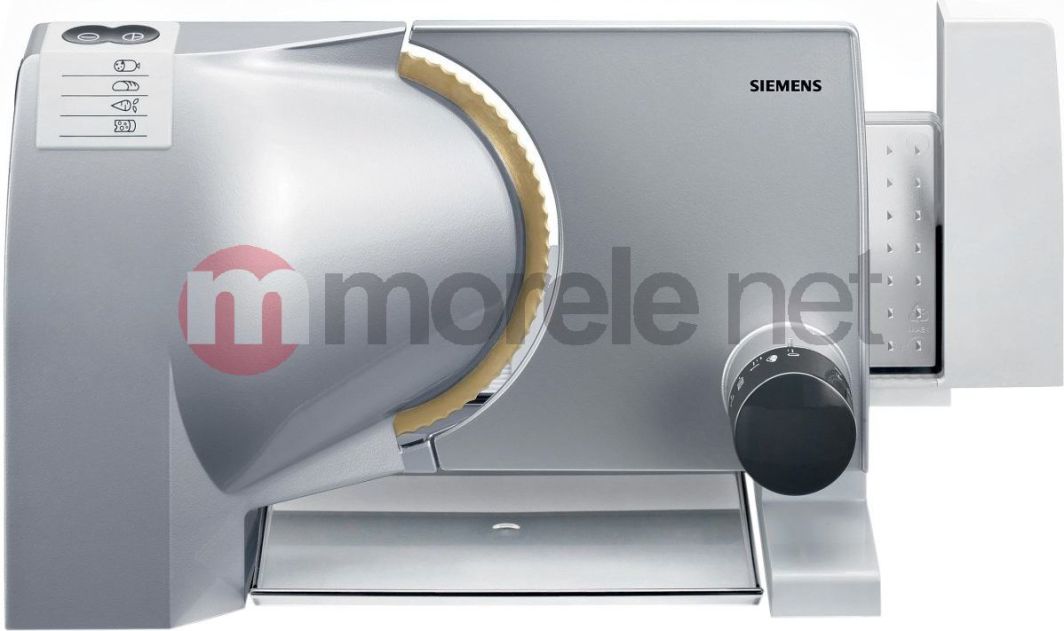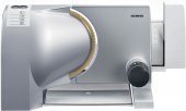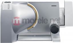 Krajalnica MS 75002N marki Siemens, w kolorze srebrnym, z regulacją grubości krojenia, metalową konstrukcją oraz z ostrzem ze stali szlachetnej pokrytym tytanem. Model ten posiada również zabezpieczenie gwarantujące ochronę kciuka podczas krojenia.