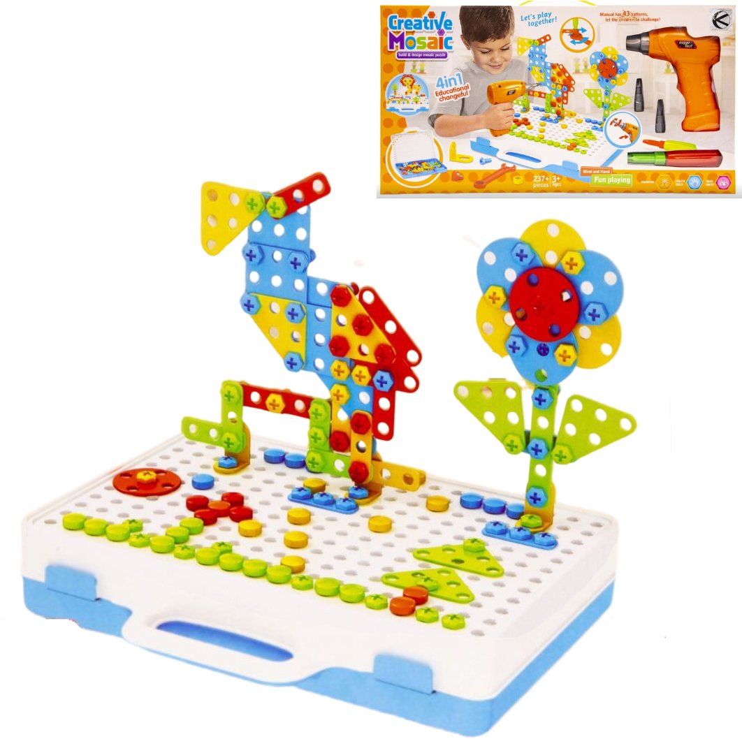 Ten produkt to marzenie każdego małego majsterkowicza! W zestawie znajduje się wiele kolorowych elementów o różnych kształtach, które pomogą w rozwijaniu wyobraźni oraz kreatywności dziecka. W zestawie znajduje się 237 elementów w tym dołączony został klucz francuski, śrubokręt a także wkrętarka na baterie. Elementy mogą zostać przykręcone zarówno przy pomocy dołączonych narzędzi, jak i własnoręcznie, co rozwija zdolności manualne dziecka.