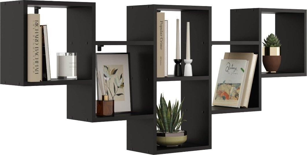 Półka ALESIA 9 czarna w stylu industrialnym wykonana jest z płyty laminowanej i wyglądem przypomina połączone ze sobą elementy kwadratowe.