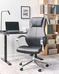 Nowoczesny design fotela sprawia, że doskonale komponuje się z różnymi stylami biurowymi. Jego czarna ekoskóra* oraz minimalistyczna forma dodają elegancji i profesjonalizmu każdemu wnętrzu.