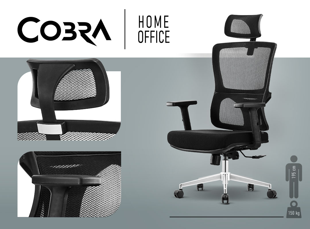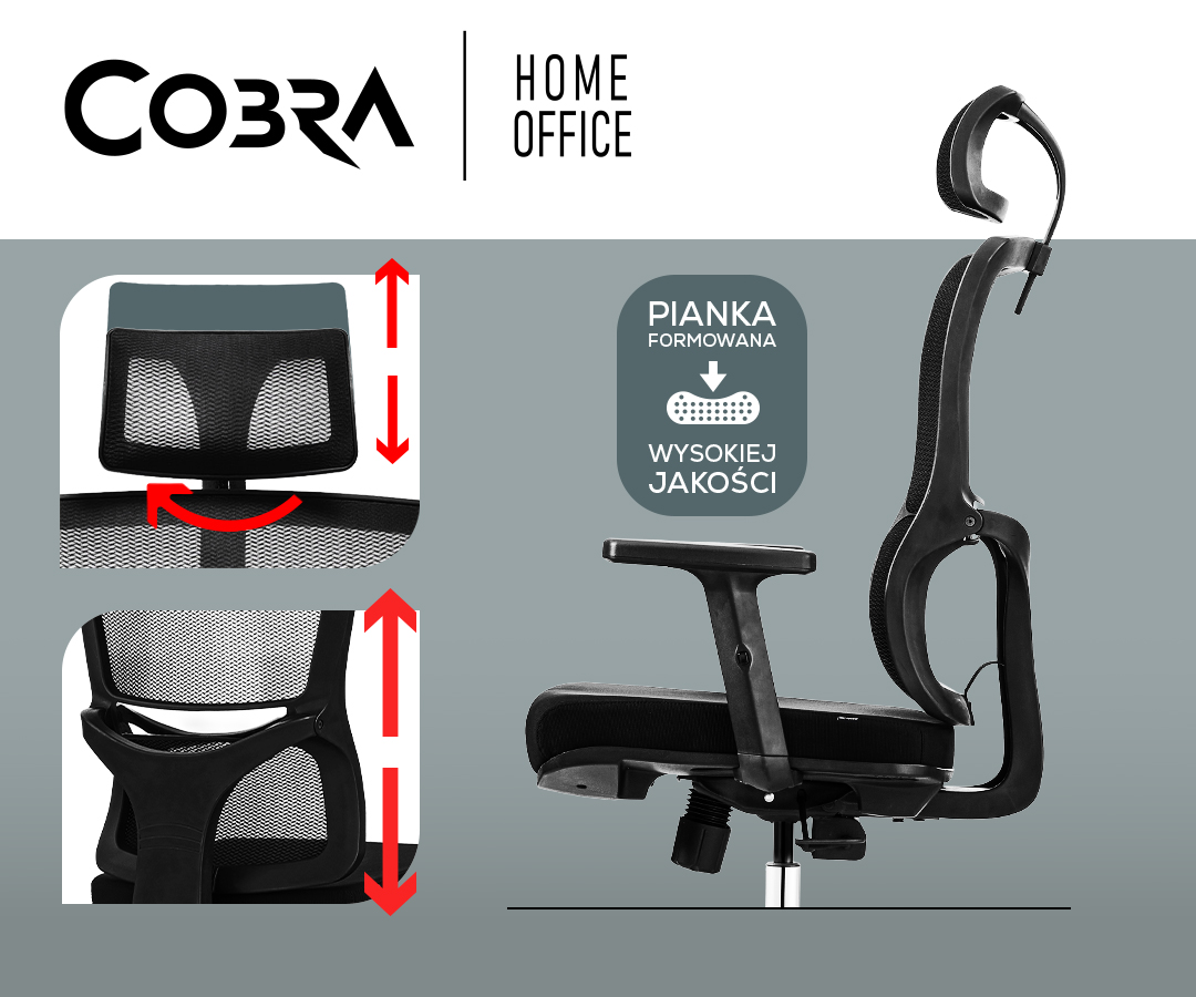 Chromowana podstawa z kółkami PU gwarantuje trwałość i płynną mobilność. Konstrukcja wytrzymuje użytkowników o wzroście do 195 cm i wadze do 150 kg, a użyte materiały zapewniają długowieczność. Cobra to marka, która łączy ergonomię z funkcjonalnością – ten model jest tego najlepszym przykładem.