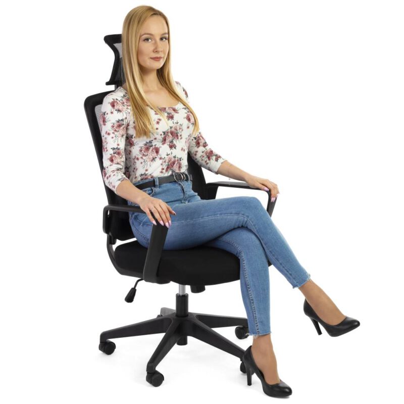 Wygodny fotel biurowy Ergosolid® AMO-70 z mechanizmem Tilt (funkcja kołysania). Fotel wykończono wytrzymałą na wycieranie tkaniną, oparcie obszyto wygodną i oddychającą siatką membranową, a obrotową podstawę wykonano z lekkiego i mocnego nylonu. Krzesło to zostało zaprojektowane tak, aby zapewniać komfort przy wielogodzinnej pracy. Odpowiednio wyprofilowane oparcie z podparciem odcinka lędźwiowego, w postaci wyjmowanej poduszki oraz regulowany zagłówek, pomagają utrzymywać prawidłową pozycję ciała. W zależności od indywidualnych potrzeb poduszkę podpierającą można przesuwać, wyjąć lub położyć bezpośrednio pod plecy.