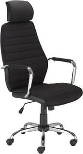 Front krzesła tapicerowany tkaniną w kolorze czarnym, tył tapicerowany imitacją skóry również w kolorze czarnym. Podstawa i podłokietniki metalowe, chromowane. Kółka samohamowne do powierzchni miękkich. Mechanizm kołysania się TILT. Regulowany zagłówek.