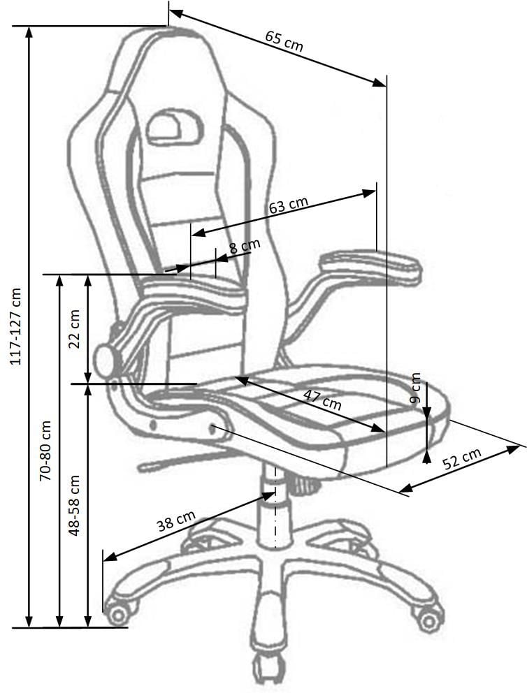 Głębokość całkowita fotela gabinetowego Halmar LOTUS wynosi 65 cm, a jego szerokość 63 cm. Wymiary wygodnego siedziska to 47x52x9 cm. Mechanizm TILT, w który wyposażone zostało krzesło umożliwia regulację jego wysokości w zakresie 117-127 cm (48-58 cm dla siedziska), a tym samym pozwala dopasować fotel do użytkownika. Innymi funkcjami mechanizmu TILT, które znacznie podnoszą poziom komfortu użytkowania fotela są: regulacja siły oporu oparcia podczas odchylenia, możliwość zablokowania fotela w odpowiedniej pozycji do pracy, a także swobodne kołysanie się na krześle.