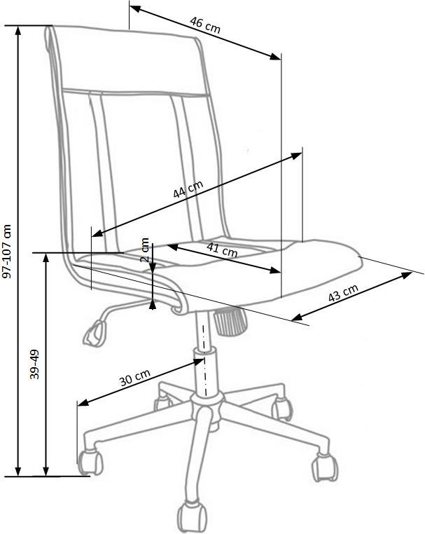 Solidna podstawa krzesła została wykonana ze stali nierdzewnej. Bardzo dobrze komponuje się z kolorystyką i stylem w jakim wykończone jest siedzisko. Można z całą pewnością powiedzieć, że model ten będzie ozdobą każdego wnętrza, w którym zostanie zastosowany. Możliwość ciągłego obrotu oraz płynnego przemieszczania się krzesła, dzięki kółkom wykonanym z wysokiej jakości tworzywa, idealnie pasuje do dynamicznego charakteru prac w miejscach takich jak serwis elektroniki lub laboratorium oraz domowych prac kuchennych. Podstawa fotela wyposażona jest także w teleskop do regulacji wysokości położenia siedziska, w zakresie pomiędzy 39 - 49 cm. Wymiary całkowite krzesła wynoszą – szerokość siedziska 44 cm, głębokość siedziska 46 cm, wysokość krzesła, regulowana w zakresie 97 - 107 cm. Solidna konstrukcja oraz tapicerka z wysokiej jakości skóry syntetycznej, idealnie sprawdzą się w dynamicznym środowisku. Fotel jest łatwy do utrzymania w czystości i nie wymaga specjalnych zabiegów konserwacyjnych. Wymiary krzesła pozwalają na wygodną pracę siedząca, a jednocześnie nie zajmuje ono zbyt dużo miejsca gdy chwilowo nie jest potrzebne.