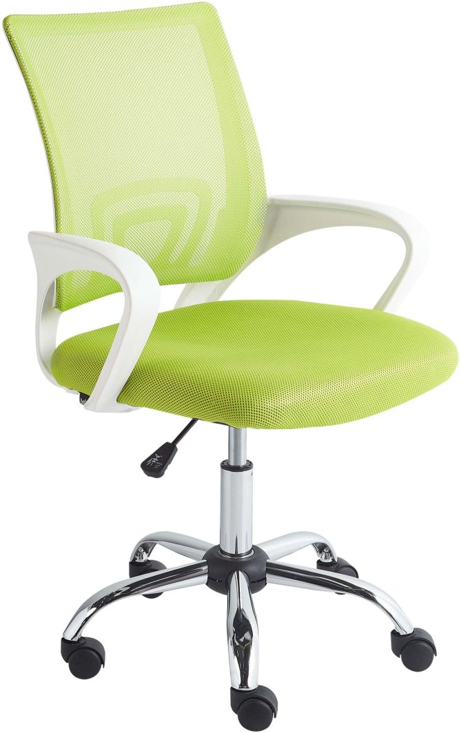 Fotel biurowy na kółkach. Krzesło biurowe, które sprawdzi się jako wyposażenie domowego home office jak i mebel do pokoju nastolatka. Ergonomiczny kształt oparcia pomaga zachować prawidłową postawę ciała, a przewiewna siatka mesh gwarantuje komfortowe użytkowanie nawet w ciepłe dni. Pod siedziskiem znajduje się dźwignia którą dopasujesz wysokość siedziska jak i odblokujesz lub zablokujesz funkcje odchylenia. Pięcioramienna obrotowa podstawa posiada lekkobieżne kółeczka.