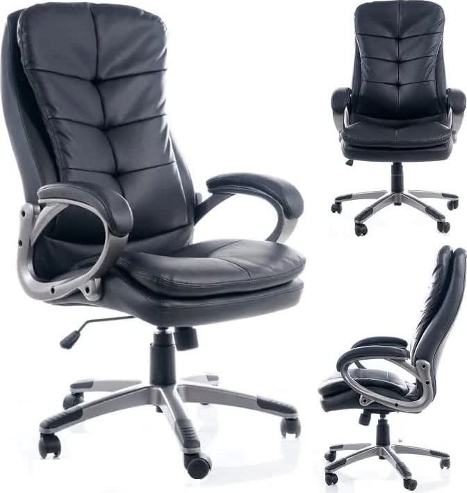 Siedzisko i oparcie fotela jest wypełnione kilkucentymetrową warstwą miękkiej pianki i tapicerowane estetyczną skórą ekologiczną w czarnym kolorze. Wygodnym rozwiązaniem jest obecność podłokietników z praktycznymi, miękkimi nakładkami. Estetyki dodaje starannie wykonane pionowe pikowanie. Wytrzymała podstawa jezdna typu krzyżak wykonana została z tworzywa sztucznego. W standardzie znajdują się kółka plastikowe.