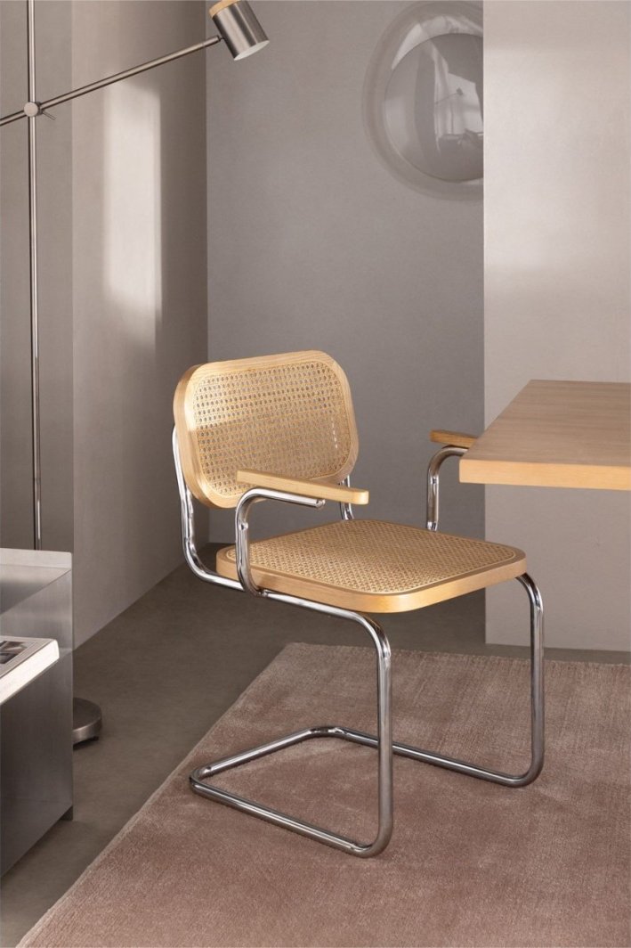 Bardzo ciekawe krzesło w stylu retro, z podłokietnikami. Podstawa została wykonana z metalu chromowanego. Konstrukcja oparcia, siedziska i podłokietników to drewno. Oparcie oraz siedzisko wypełnione jest rattanową plecionką wiedeńską.
