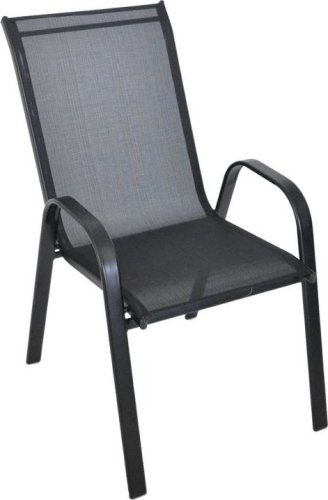 Krzesło ogrodowe z solidną metalową konstrukcją i tapicerką wykonaną z czarnej sztucznej tkaniny dla wygodnego relaksu w ogrodzie lub na tarasie.