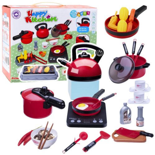 ZESTAW KUCHENNY GARNKI JEDZENIE AKCESORIA 36 EL. Zestaw kuchenny do gotowania to wyjątkowa propozycja dla dzieci, które uwielbiają wcielać się w rolę kucharza. Komplet zawiera aż 36 elementów, które imitują prawdziwe naczynia, przybory kuchenne i składniki potraw. Znajdziemy tu między innymi czajnik, patelnię, szybkowar, garnek z pokrywką, grill, deskę do krojenia, sushi z pałeczkami oraz ruchomą płytę grzewczą z dźwiękami smażenia i gotowania. Wszystko wykonane z dbałością o szczegóły i w atrakcyjnej, czerwono-czarnej kolorystyce. Zabawka wspiera rozwój wyobraźni, uczy zasad gotowania, obowiązkowości i organizacji pracy w kuchni. To również świetny sposób na spędzenie czasu wspólnie z rodzicami lub rówieśnikami. Różnorodność akcesoriów pozwala na tworzenie scenek kulinarnych i udawanie, że przygotowujemy prawdziwe dania - w tym sushi, steki, warzywa czy jajka. Zestaw zapakowany w oryginalne opakowanie - idealny pomysł na prezent dla każdego małego szefa kuchni. SPECYFIKACJA: Liczba elementów: 36 Zasilanie: 3 x AA (brak w zestawie, dotyczy płyty grzewczej) Płyta grzewcza: dźwięk gotowania i smażenia, świecące diody Temperatury na panelu: 200-800 Wymiary opakowania: 28 x 23,5 x 18 cm Wymiary płyty grzewczej: 19,7 x 16,4 x 3,3 cm Wymiary czajnika: 15,5 x 12,5 cm Wymiary patelni: 21 x 4 cm Wymiary szybkowaru: 23 x 12,5 cm Materiał: tworzywo sztuczne Typ zabawki: edukacyjna, kuchnia ZAWARTOŚĆ ZESTAWU: Płyta grzewcza Czajnik Garnek z pokrywką Szybkowar Patelnia Deska do krojenia Grill z rusztem 2 półmiski do sushi 2 miseczki na sos 4 patyczki do sushi 3 patyczki do grilla 2 kubeczki Sztućce kuchenne: tasak, łopatka, chochla, szpatułka, durszlak, łyżka do makaronu, nóż do pizzy Produkty spożywcze: jajko, kiełbaska, steki, skrzydełko kurczaka, kukurydza Butelki: mleko czekoladowe, ketchup