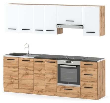 Kuchnia modułowa Mokka Plus o długości 2,4 m to nowoczesny i funkcjonalny zestaw mebli kuchennych, który idealnie sprawdzi się zarówno w klasycznych, jak i nowoczesnych aranżacjach. Dzięki przemyślanej konstrukcji oraz dużej liczbie szafek i szuflad, zapewnia wygodę użytkowania oraz mnóstwo miejsca do przechowywania. Zestaw o szerokości 240 cm jest odpowiedni zarówno do mniejszych, jak i bardziej przestronnych wnętrz.