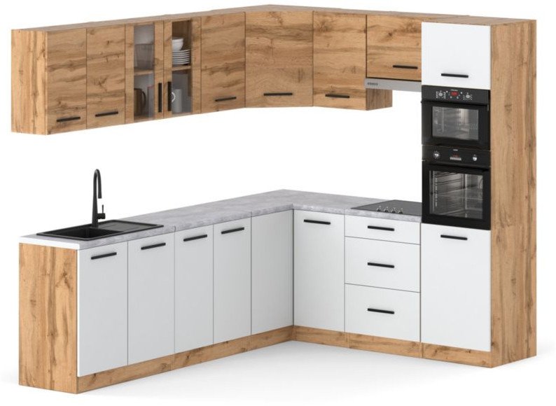 Zestaw wyróżnia się nowoczesnym designem, łącząc kolor dąb wotan z białym matowym wykończeniem, co nadaje mu niepowtarzalnego charakteru. Dzięki zastosowaniu płyty laminowanej o grubości 16 mm, kuchnia nie tylko prezentuje się atrakcyjnie, ale także jest trwała i odporna na codzienne użytkowanie.