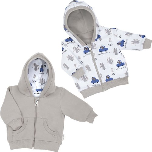 Kurtka dwustronna dla chłopca. Jedna strona wykonana z bawełny dresowej w kolorze szarym, druga strona z białej bawełny drukowanej przedstawiającej motyw lasu, pieska w samochodziku. Materiał posiada certyfikat Oeko-Tex Standard 100 Tekstylia godne zaufania.