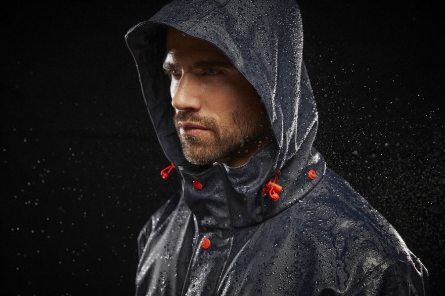 Kurtka przeciwdeszczowa. Chowany kaptur posiada regulację sznurka z przodu. Tył kurtki jest przedłużony dla lepszego komfortu.