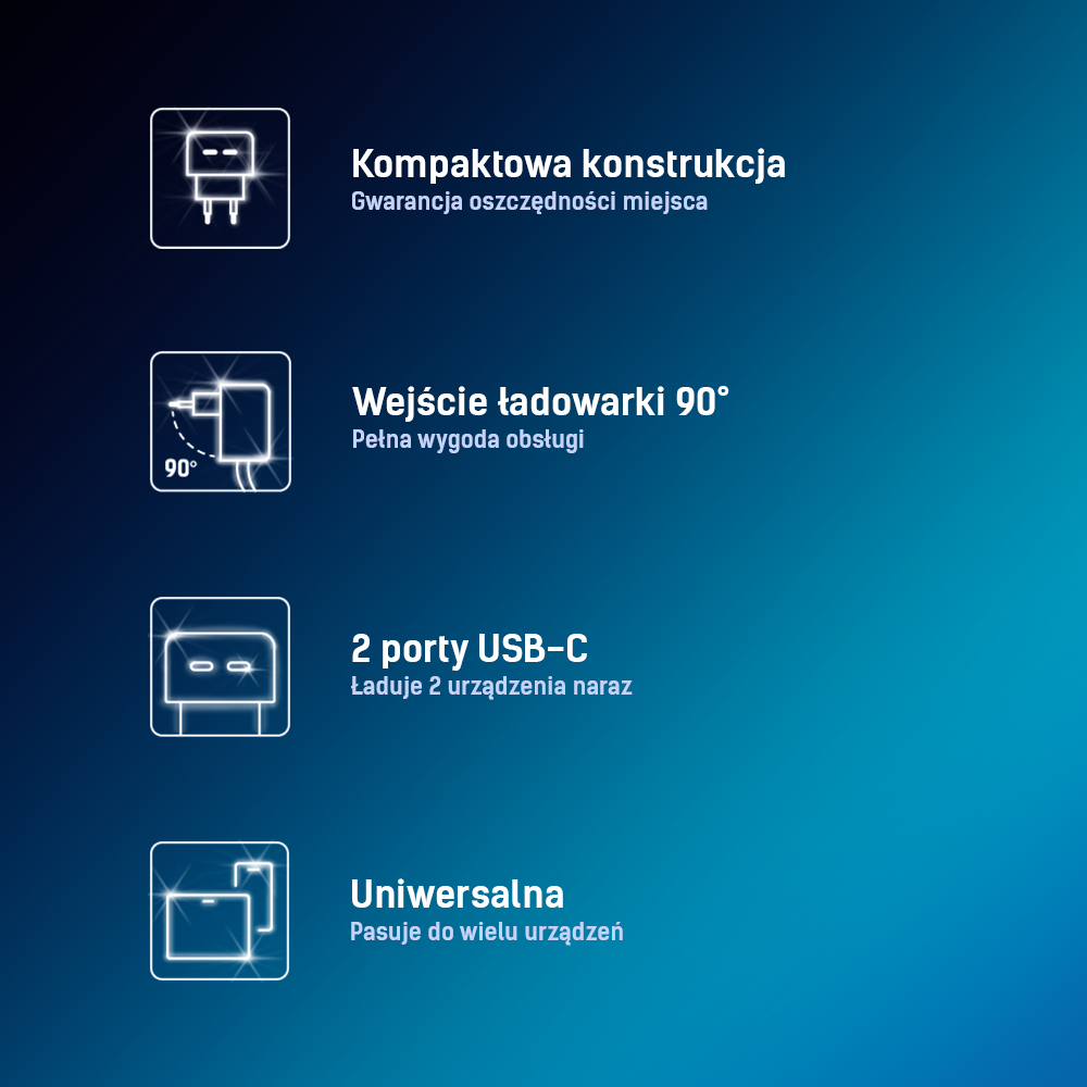 Nowoczesne rozwiązanie jakim jest standard USB-C pozwala na bardzo szybkie i sprawne ładowanie urządzeń. Szeroka kompatybilność tej technologii pozwala na wygodę i ułatwia codzienne życie. Ta ładowarka posiada 2 wyjścia USB-C, dzięki którym zapomnisz o problemach z ładowaniem Twojego urządzenia.