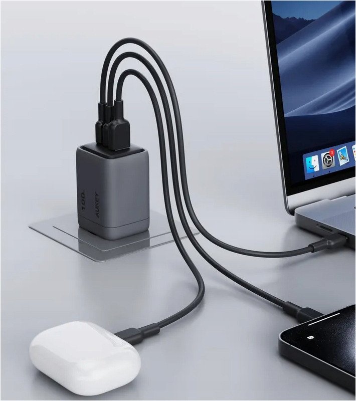 Ładowarka AUKEY PA-C5 jest wyposażona w trzy porty, w tym jeden port USB i dwa porty USB-C, co umożliwia jednoczesne ładowanie trzech urządzeń.