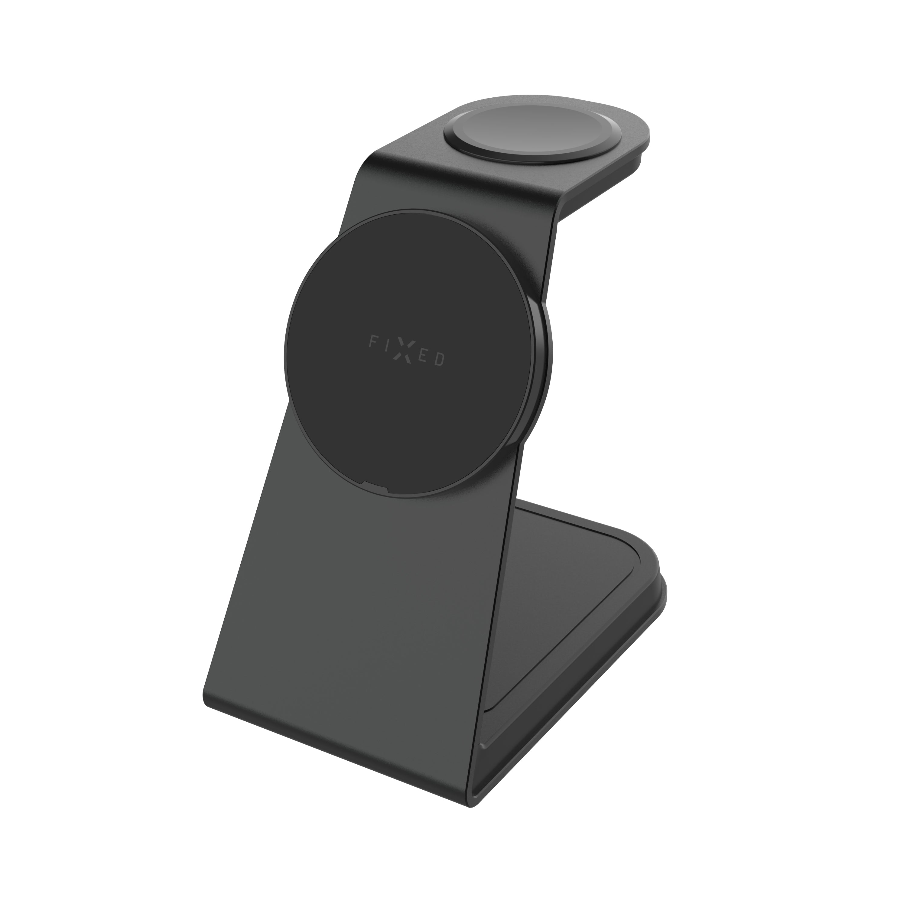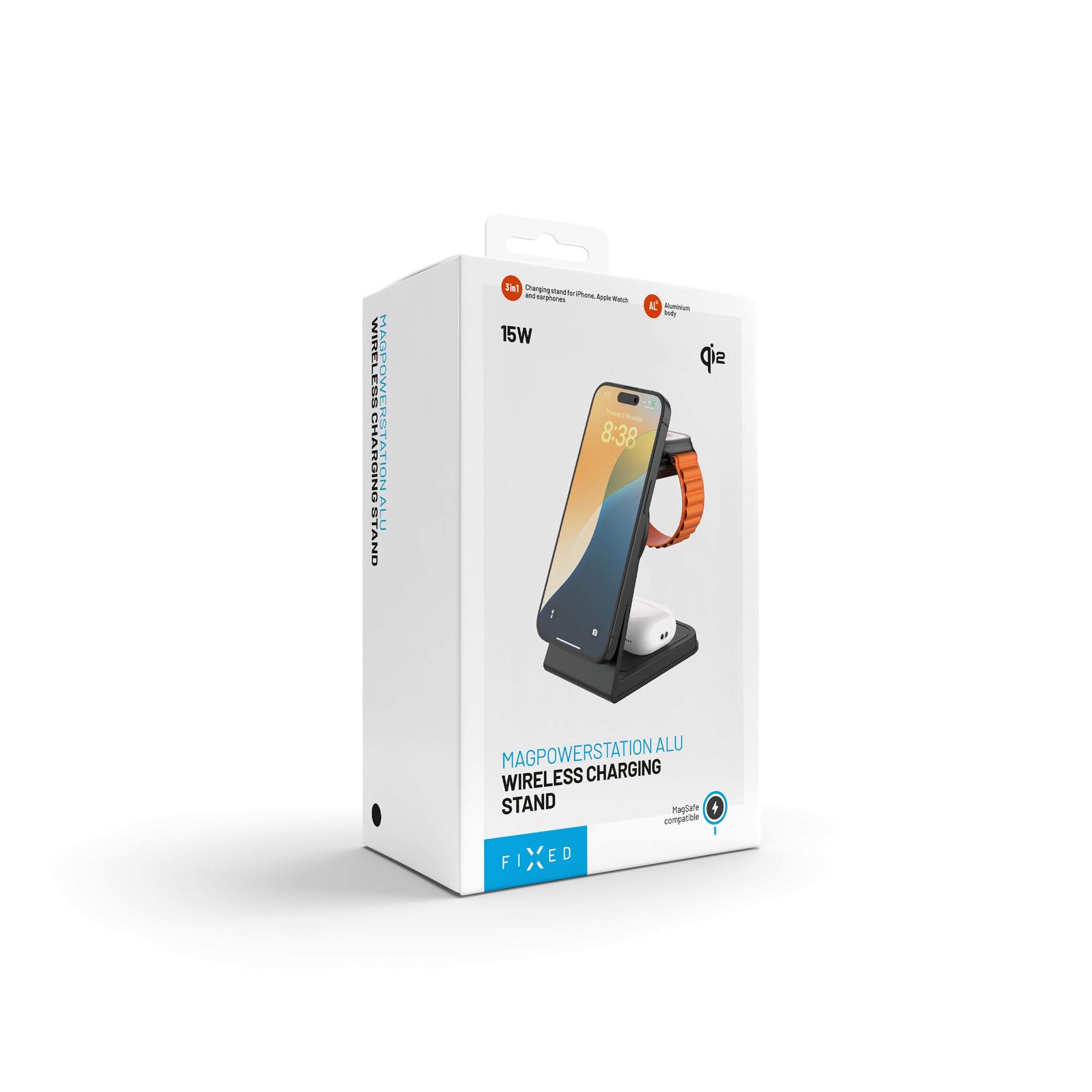 Bezprzewodowa podstawka ładująca FIXED MagPowerstation Alu 2 to eleganckie i funkcjonalne rozwiązanie do codziennego ładowania nawet trzech urządzeń jednocześnie. Umożliwia wygodne ładowanie telefonu z obsługą MagSafe, słuchawek bezprzewodowych i smartwatchy w jednym miejscu. Wystarczy położyć telefon na owalnej powierzchni ładującej, gdzie dzięki silnym magnesom automatycznie się przyklei i rozpocznie bezprzewodowe ładowanie z mocą do 15 W. Główna powierzchnia wykorzystuje najnowszą technologię Qi2, która zapewnia szybkie i wydajne ładowanie. Druga powierzchnia ładująca przeznaczona jest do AirPodsów lub innych słuchawek bezprzewodowych, które ładują się z mocą 3,5 W, trzecia służy do ładowania Apple Watch z mocą 2,5 W. Konstrukcja podstawki wykonana jest z wysokiej jakości szczotkowanego stopu aluminium w nowoczesnym odcieniu, który idealnie komponuje się z designem produktów Apple. Wszystkie powierzchnie ładujące pokryte są miękką silikonową powłoką, która chroni urządzenie przed zarysowaniami. Antypoślizgowe podkładki na spodzie zapewniają stabilność podstawki na różnych rodzajach powierzchni. Zasilanie odbywa się poprzez złącze USB-C. Aby uzyskać pełną wydajność, zaleca się korzystanie z zasilacza o mocy co najmniej 30 W PD 3.0 (zasilacz nie jest dołączony do zestawu).